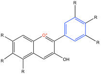 Las antocianinas (Figura 5) también son responsables por los colores rojos en algunos alimentos, además de que contribuyen al color azul y violeta de otros1; por ejemplo, de los arándanos.