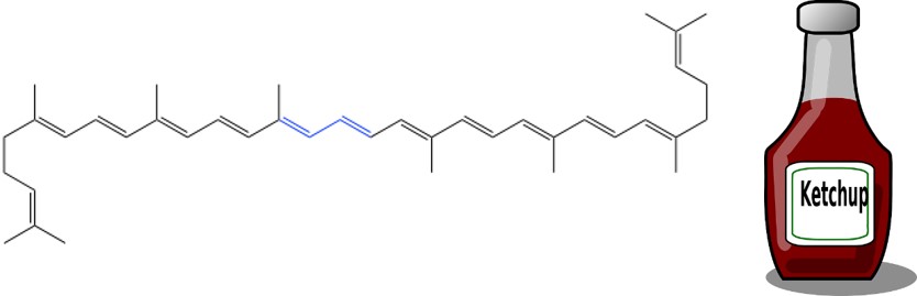 Ahora que ya hemos cubierto de manera general por qué vemos unos colores en específicos, podemos comenzar a discutir cómo esto se relaciona a los colores que vemos en diferentes alimentos. Tal vez estés familiarizado con el licopeno (ver estructura en la Figura 4) y el beta-caroteno, de verlos venderse en los supermercados y tiendas de salud como suplementos nutricionales; o tal vez incluso has leído sobre los grandes beneficios del licopeno, justo detrás de tu botella de ketchup favorita. Licopeno y β-caroteno pertenecen a una clase de moléculas llamadas carotenos; responsables por la apariencia roja, anaranjada y amarilla de algunos alimentos. El licopeno es abundante en algunos frutos rojos, como los tomates; mientras que el beta-caroteno abunda en alimentos anaranjadas, como las zanahorias.Ahora que ya hemos cubierto de manera general por qué vemos unos col